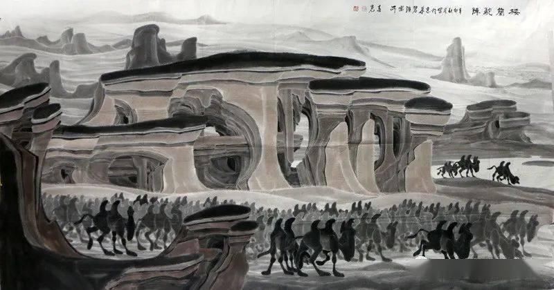 陆机《文赋》中说:“笼天地于形内,挫万物于笔端。”中国的画家造化天地,写形万物,终究需要个性充盈的特点呈现于纸面上幻化成万物,所以南朝宗炳说“……山水,质而趋灵。”,独特的画面形质也才能生发出迥异常人的画面审美情趣。舒春光先生的山水绘画,以纯粹“没骨”笔态为媒介,造型边塞山水之形,呈现出其独有的笔墨意韵情态。如成功美术馆馆藏《楼兰驼阵》一作,画家以不同墨色、不同色彩,用没骨笔墨错落期间,构形风雨侵蚀的西域楼兰鬼斧神工的雅丹地貌。不同层次砂石土层,在这样的笔墨形态下形成自然界限,国画独有工具毛笔滃染而成的墨彩块面浓淡渗透,厚重且富于体积感,充分发挥了国画笔墨“骨”的艺术感受。再有千万骆驼营造庞大驼阵亦是如此,画家下笔墨彩蕴涵水分有别,自然远近、疏密有致,这种独有的纯粹水墨延展勾画内部本身产生的力量感,在与观者观感的共鸣共情中跃动出恢宏、苍茫的情感态度和生命想象。